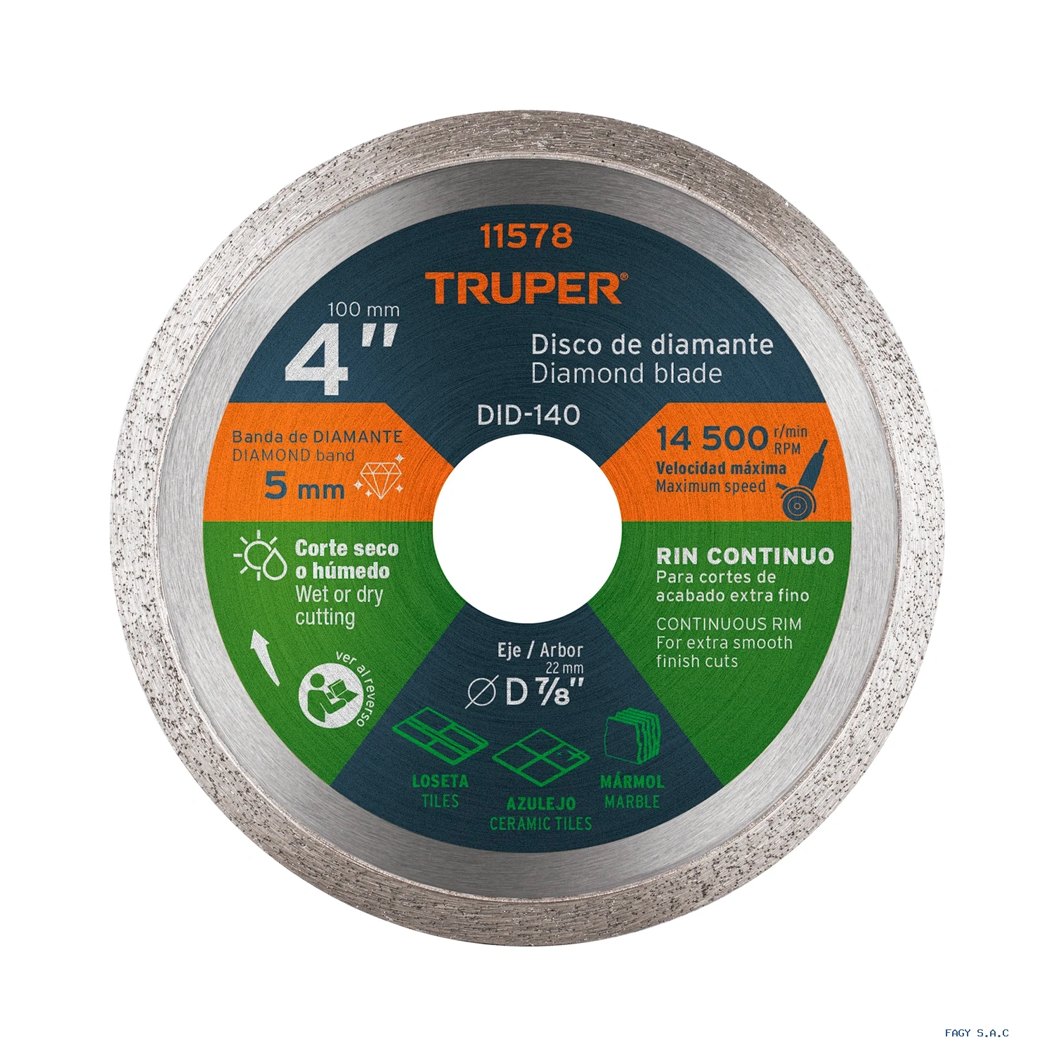 Disco de diamante de 4" x 1.6 mm, rin continuo, TRUPER 11578 DID-140